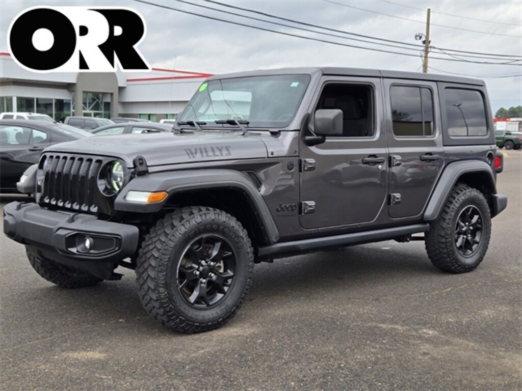 Convenience Group (Universal Garage Door Opener), LED Headlamp & Fog Lamp Group (Front LED Fog Lamps and LED Premium Reflector Headlamps), Quick Order Package 22W Willys (4-Wheel Drive Swing Gate Decal, Anti-Spin Differential Rear Axle, Automatic Headlamps, Black Grille, Black Trail Rated Badge, Deep Tint Sunscreen Windows, Front 1-Touch Down Power Windows, Leather Wrapped Steering Wheel, Matte Black Jeep Badge, Mold In Color Bumper w/Gloss Black, Power Heated Mirrors, Remote Keyless Entry, Security Alarm, Speed Sensitive Power Locks, Sun Visors w/Illuminated Vanity Mirrors, Wheels: 17" x 7.5" Moab Black Aluminum, Willys, Willys Hood Decal, and Wrangler Decal), Quick Order Package 23W Willys, Technology Group (7.0" Touchscreen Display, Air Conditioning w/Auto Temperature Control, Air Filtering, Apple CarPlay, Cluster 7.0" TFT Color Display, For More Info, Call 800-643-2112, Google Android Auto, GPS Antenna Input, Integrated Center Stack Radio, Radio: Uconnect 4 w/7" Display, SiriusXM Radio Service, SiriusXM Satellite Radio, and USB Host Flip), 3.45 Rear Axle Ratio, 4-Wheel Disc Brakes, 8 Speakers, ABS brakes, Air Conditioning, Alpine Premium Audio System, AM/FM radio, Aux Battery, Black 3-Piece Hard Top, Brake assist, Cloth Low-Back Bucket Seats, Compass, Delay-off headlights, Driver door bin, Driver vanity mirror, Dual front impact airbags, Dual front side impact airbags, Electronic Stability Control, Freedom Panel Storage Bag, Front anti-roll bar, Front Bucket Seats, Front Center Armrest w/Storage, Front fog lights, Front reading lights, Integrated roll-over protection, Jeep Trail Rated Kit, Low tire pressure warning, Manufacturer's Statement of Origin, MOPAR All-Weather Floor Mats (DISC), No Soft Top, Non-Lock Fuel Cap w/o Discriminator, Normal Duty Suspension, Occupant sensing airbag, Outside temperature display, ParkView Rear Back-Up Camera, Passenger door bin, Passenger vanity mirror, Power steering, Radio data system, Radio: Uconnect 3 w/5" Display, Rear anti-roll bar, Rear reading lights, Rear Window Defroster, Rear Window Wiper/Washer, Speed control, Split folding rear seat, Steering wheel mounted audio controls, Stop-Start Dual Battery System, Tachometer, Telescoping steering wheel, Tilt steering wheel, Traction control, Trip computer, Variably intermittent wipers, and Wheels: 17" x 7.5" Black Steel Styled.